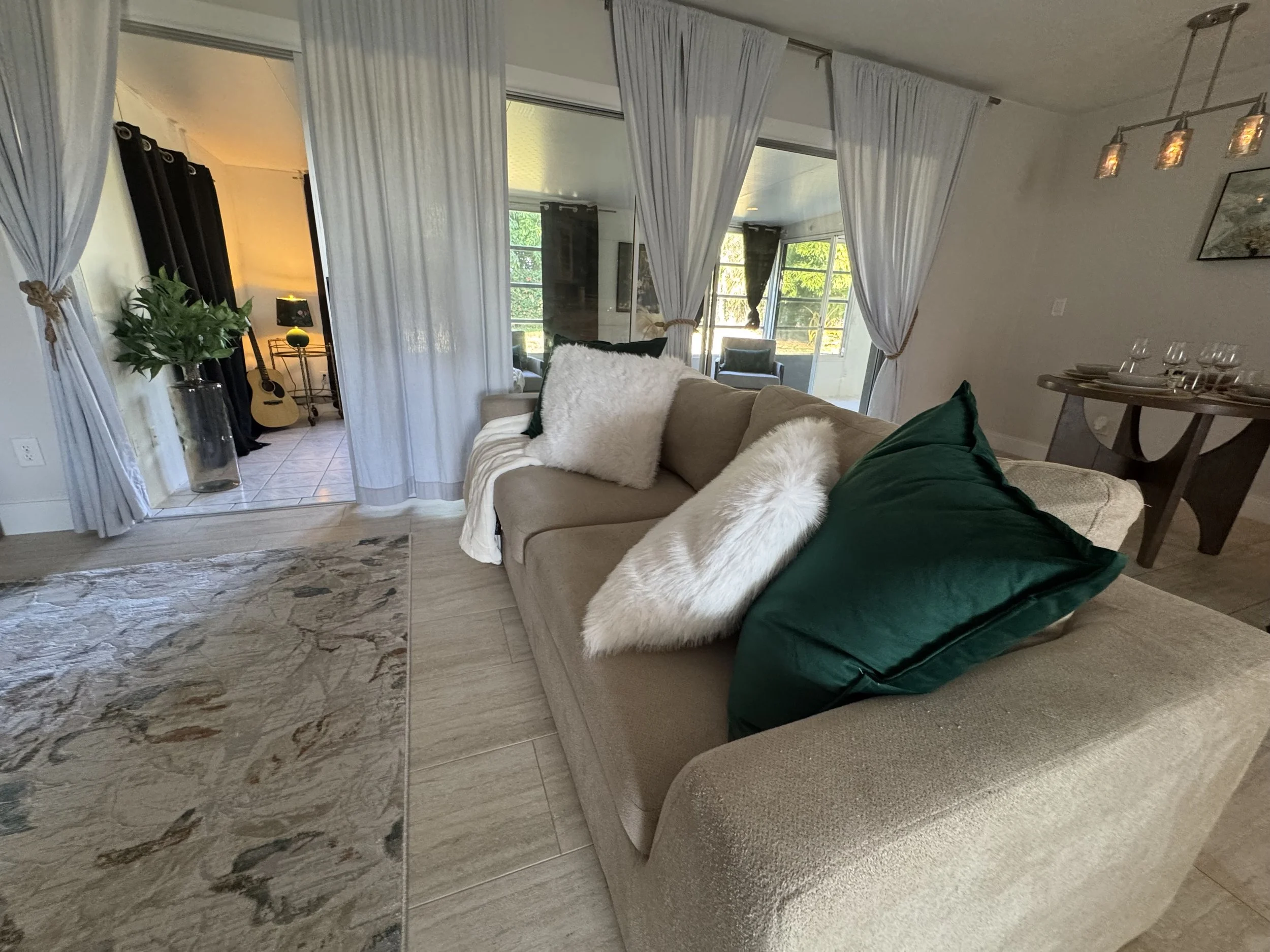 This warm and inviting home features 2 bedrooms and 2 full bathrooms, comfortably accommodating up to 5 guests (including one person on the living room couch).